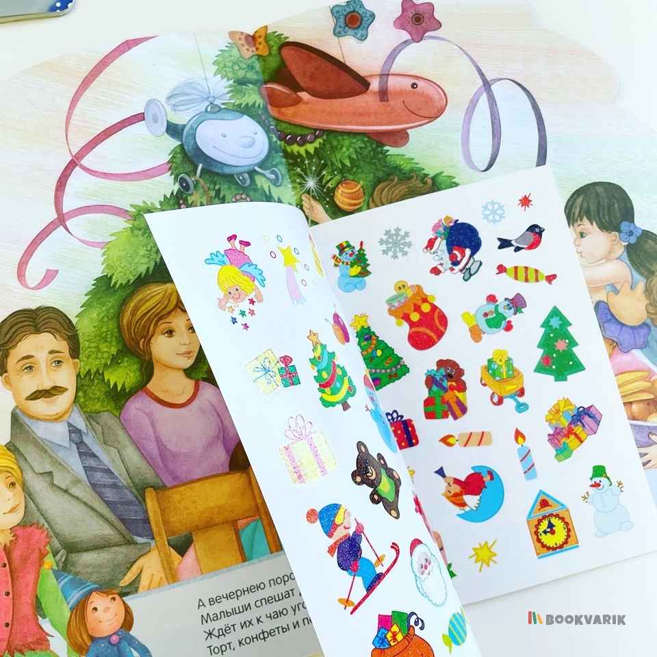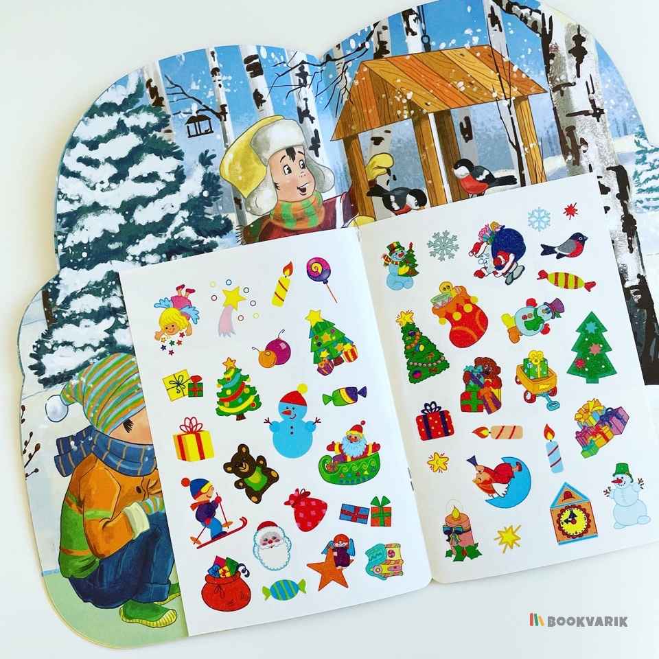 Внутри книжки маленького читателя ждет сюрприз – набор ярких новогодних наклеек, с помощью которых он сможет украсить праздничную открытку, поделку или подарочную упаковку.