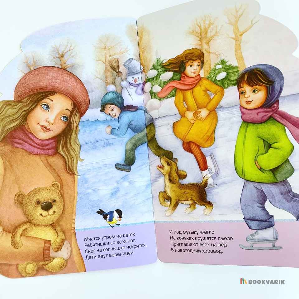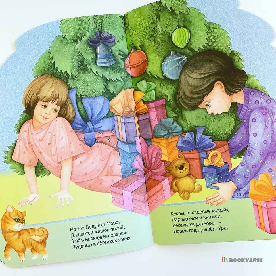 Каждый разворот – это новый сюжет на новогоднюю тему: дети наряжают елку, веселятся на маскараде, рассматривают подарки, которые Дед Мороз оставил для них под елочкой.