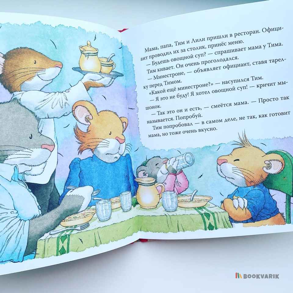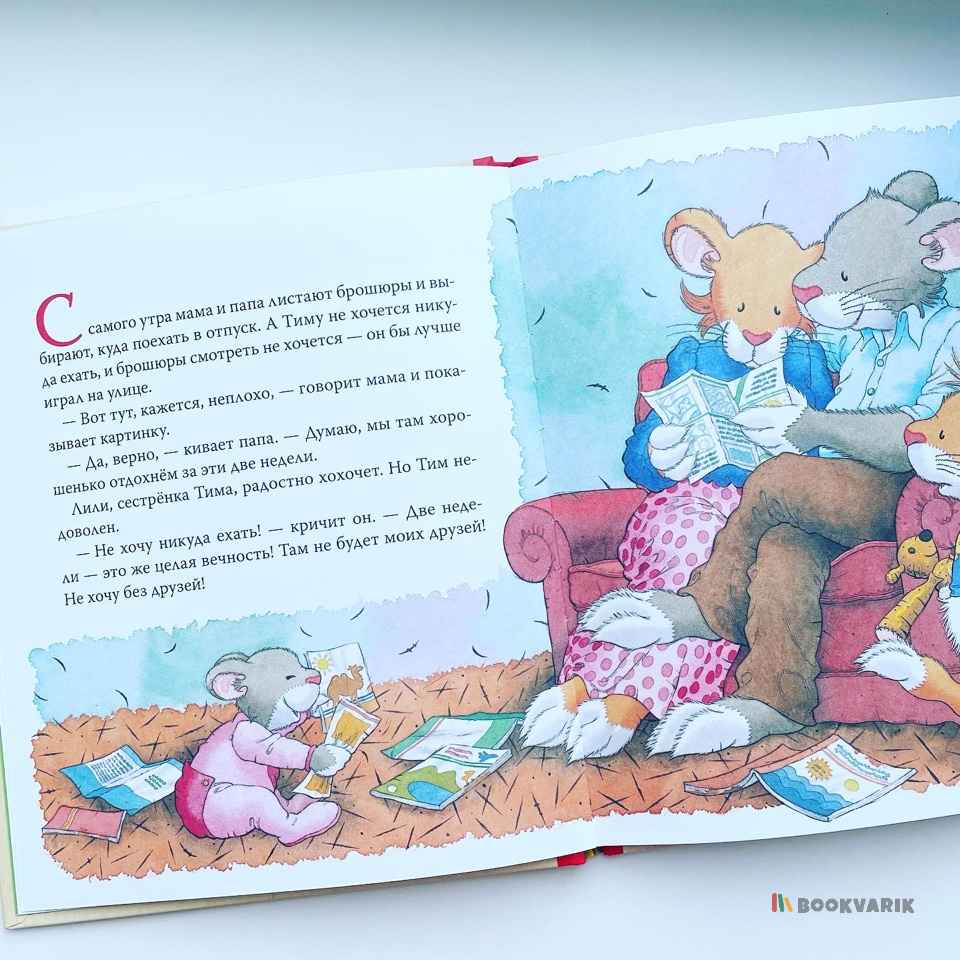 Родители мышонка Тима планируют поехать в отпуск. Вот только Тим против! Ехать долго и скучно. Другая еда, другая кроватка! Придется расстаться с друзьями на целых две недели! Да еще и игрушки оставить дома – просто немыслимо! Но Тим еще не знает, что семейная поездка будет полна ярких впечатлений и новых знакомств.