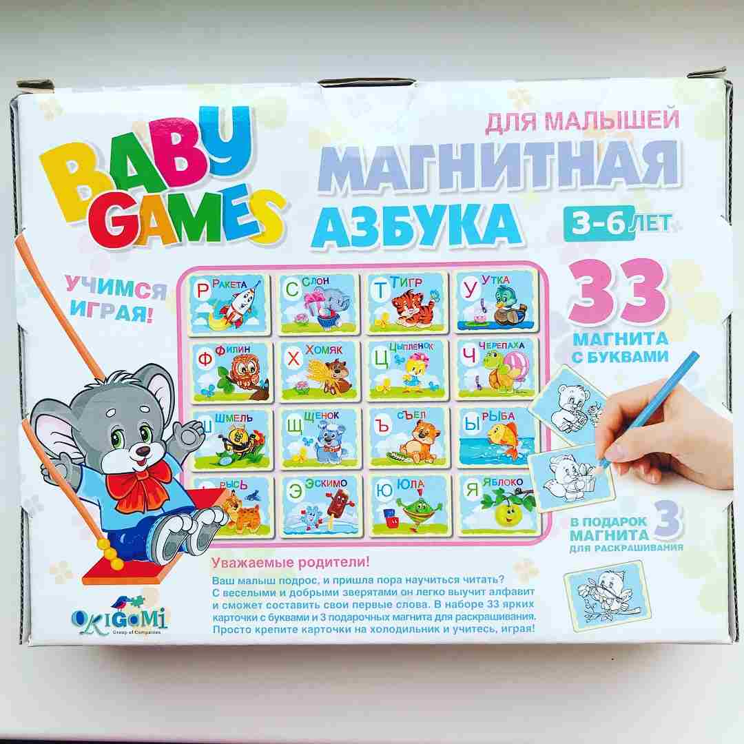 В комплект входит 33 магнита с буквами, а также яркими изображениями животных, фруктов и предметов, название которых начинается на соответствующую букву.