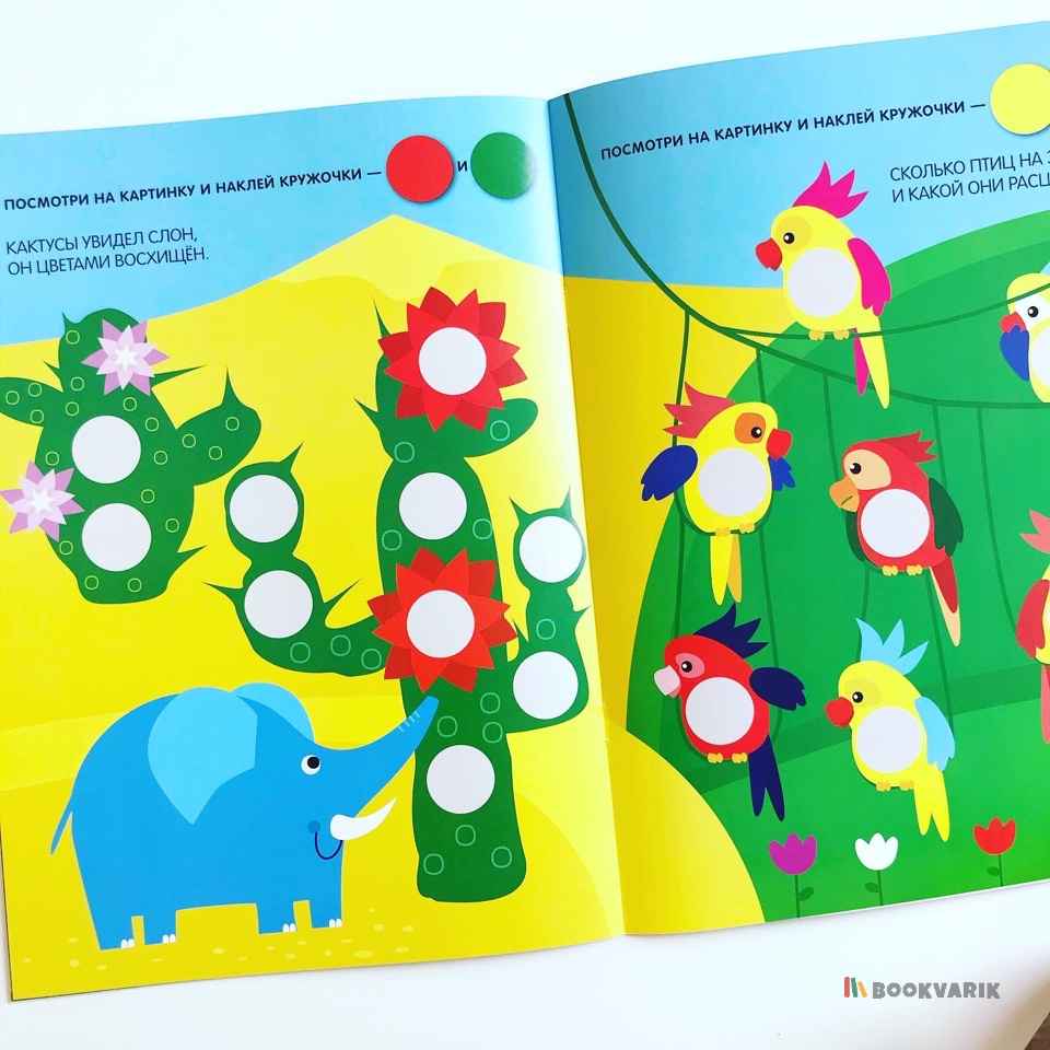 В ней Вас ждут 140 наклеек в виде разноцветных кружочков, простые весёлые стихи, красочные иллюстрации, доступные развивающие задания (подобрать наклейки-кружочки по цветам и приклеить их в нужное место).