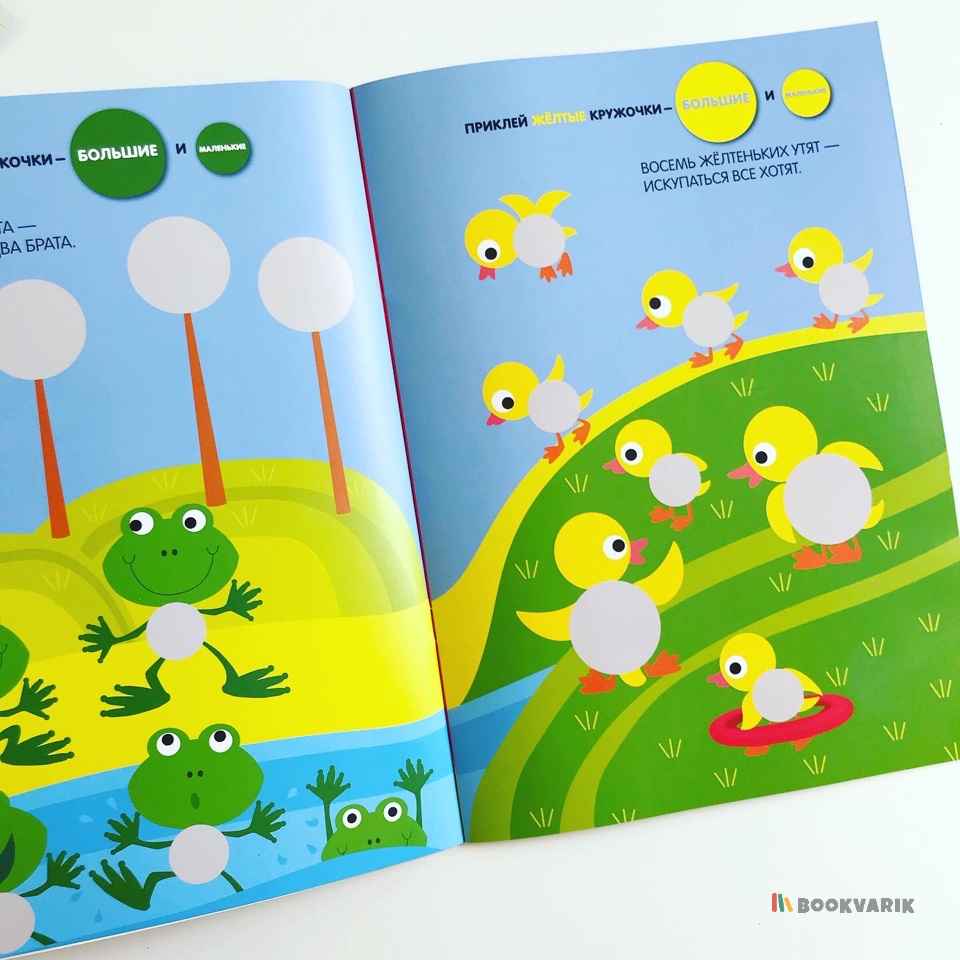 В этой весёлой книжке ребёнку предлагаются доступные развивающие задания: подобрать наклейки-кружочки по размеру и приклеить в нужное место.