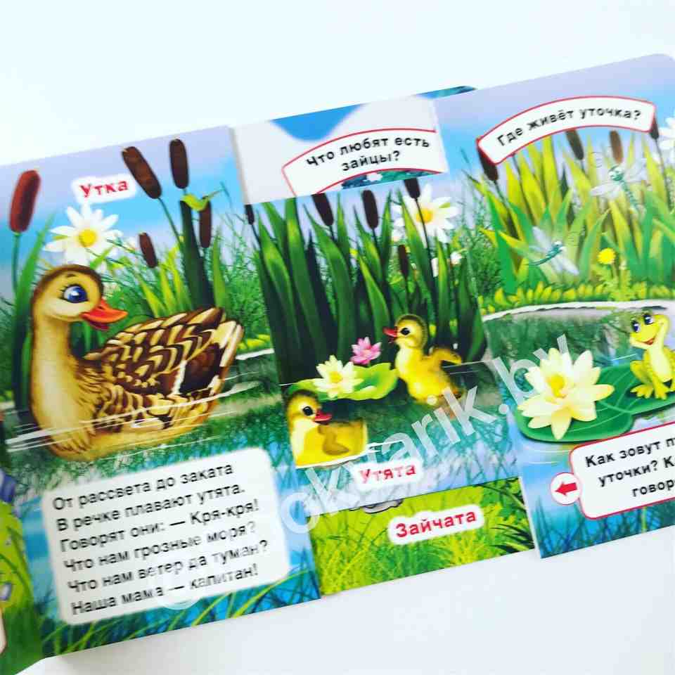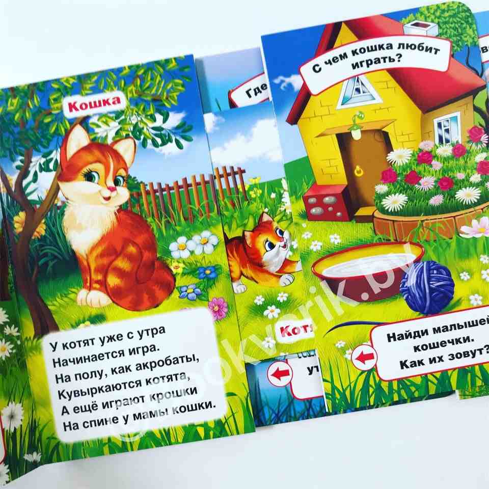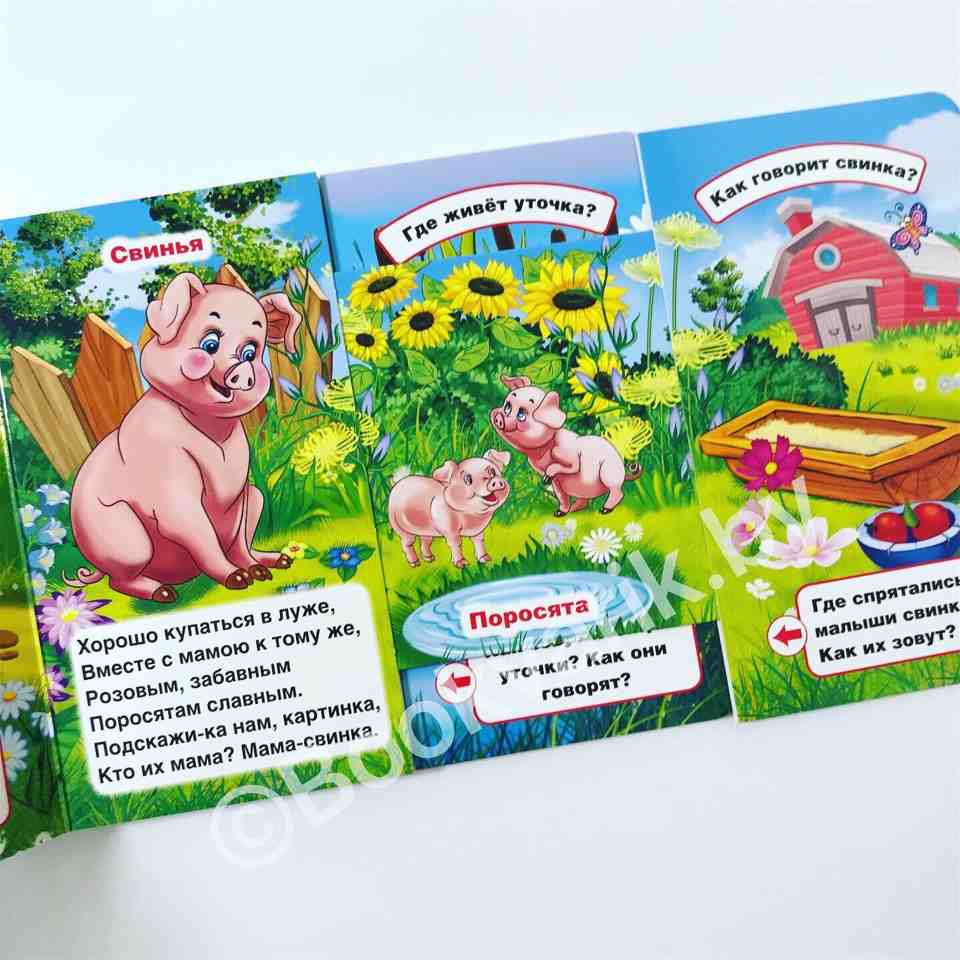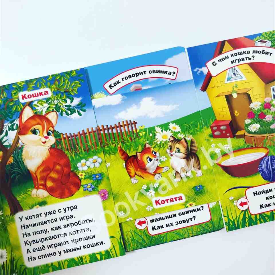 Необычный формат книжки с домашними животными и их малышами заинтересует ребёнка.Он узнает, что малыш курицы - цыплёнок, а кошечки - котёнок.