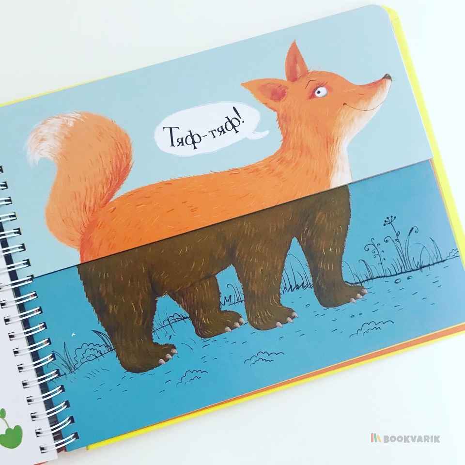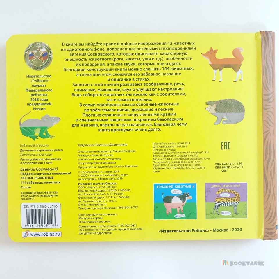 Благодаря конструкции книги, из двух половинок картинки можно сложить 144 животных, а слева при этом сложится его забавное название и описание в стихах.
