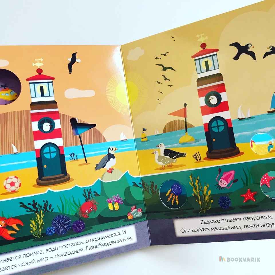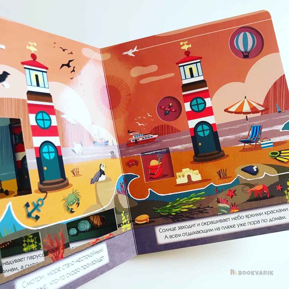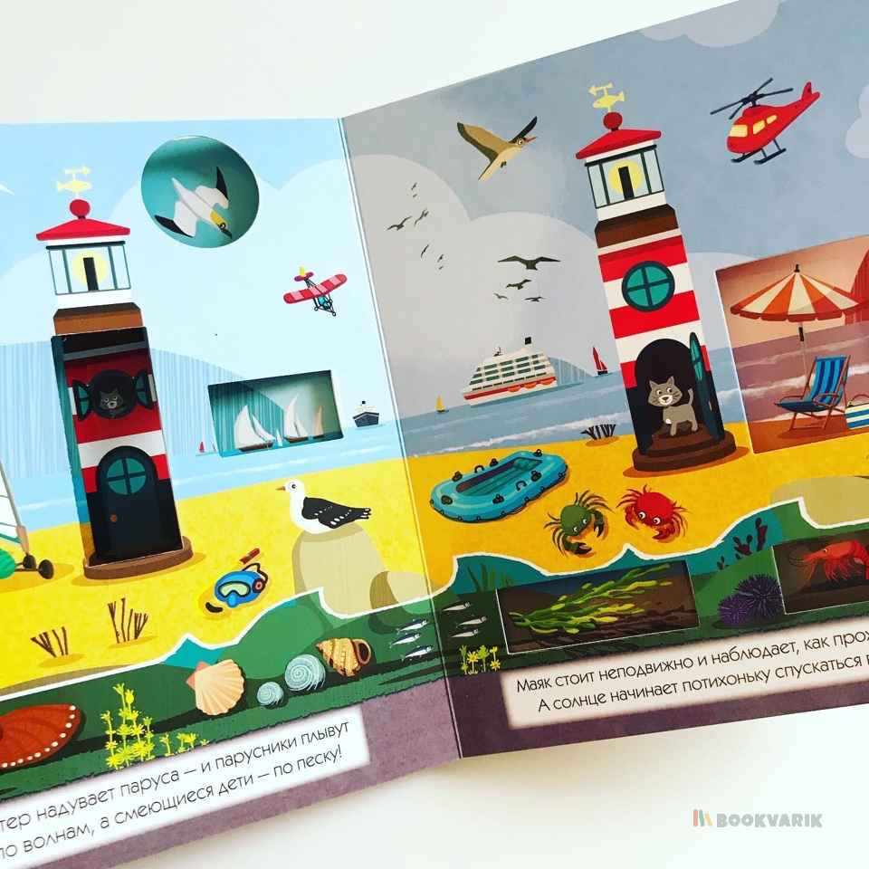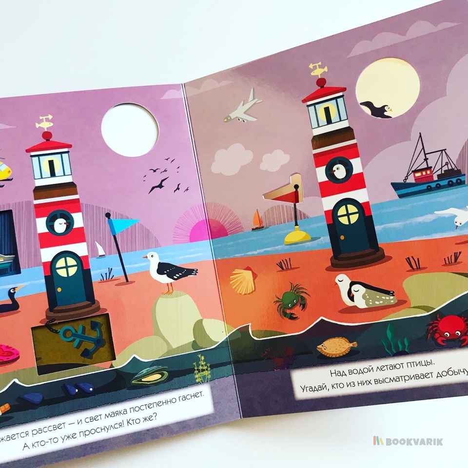 Проведите один день на берегу моря и узнайте, как меняется окружающий мир в зависимости от времени суток. Вы можете читать эту книгу и играть с ней: заглядывая в сквозные окошки, вы будете находить героев истории - дельфина, чайку или морскую звезду. На каждой странице детали сменяют друг друга - это так увлекательно, а еще способствует развитию наблюдательности у ребенка.