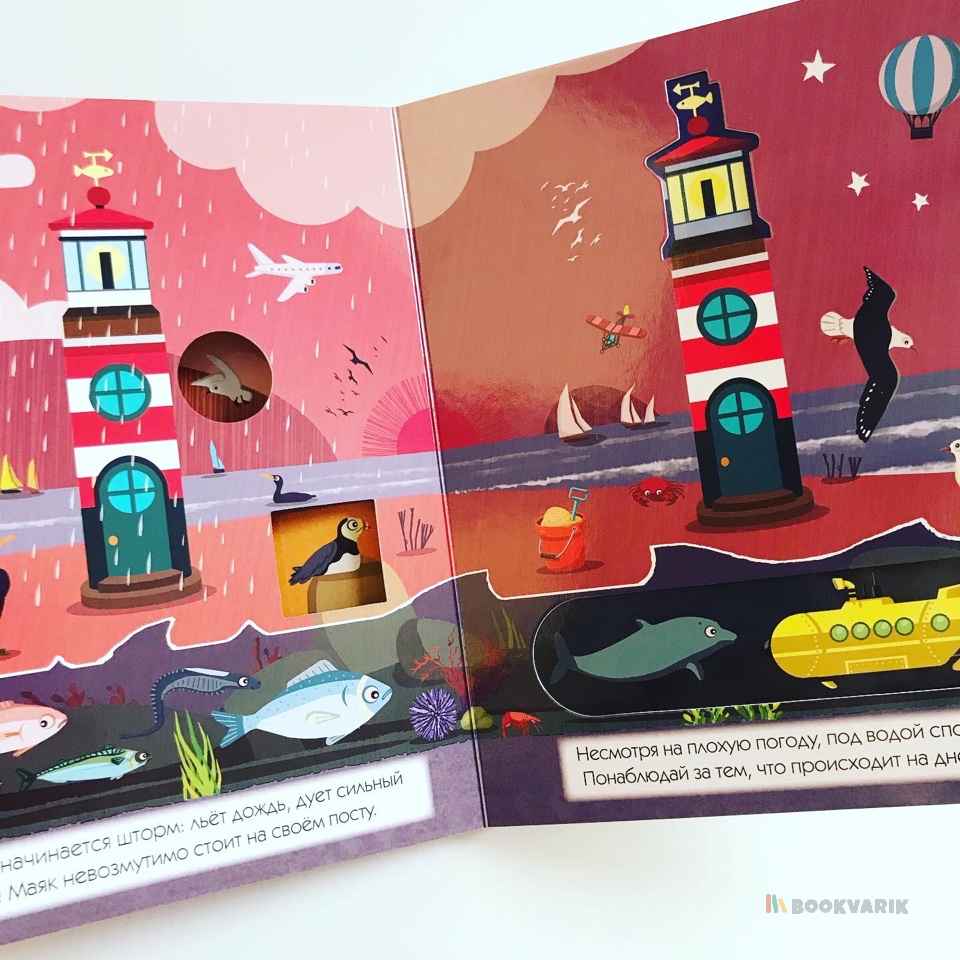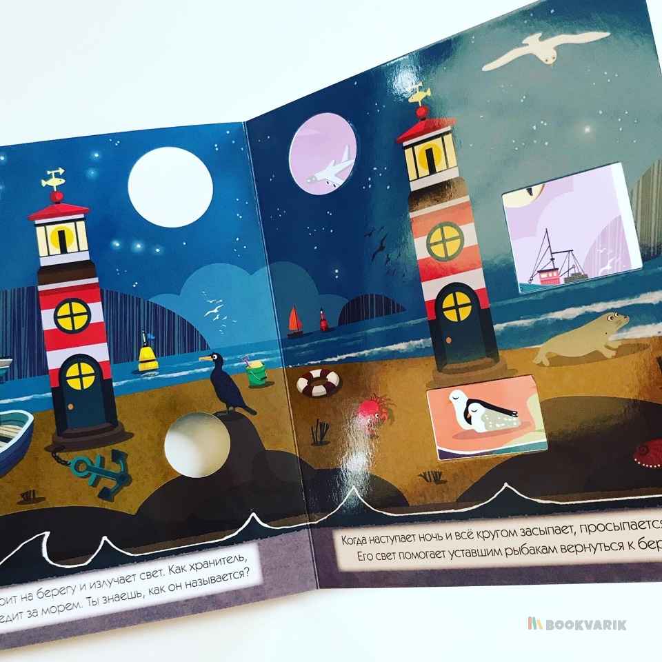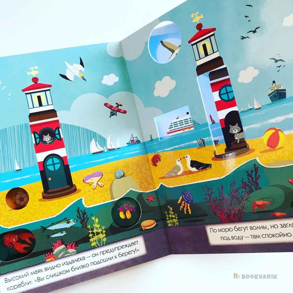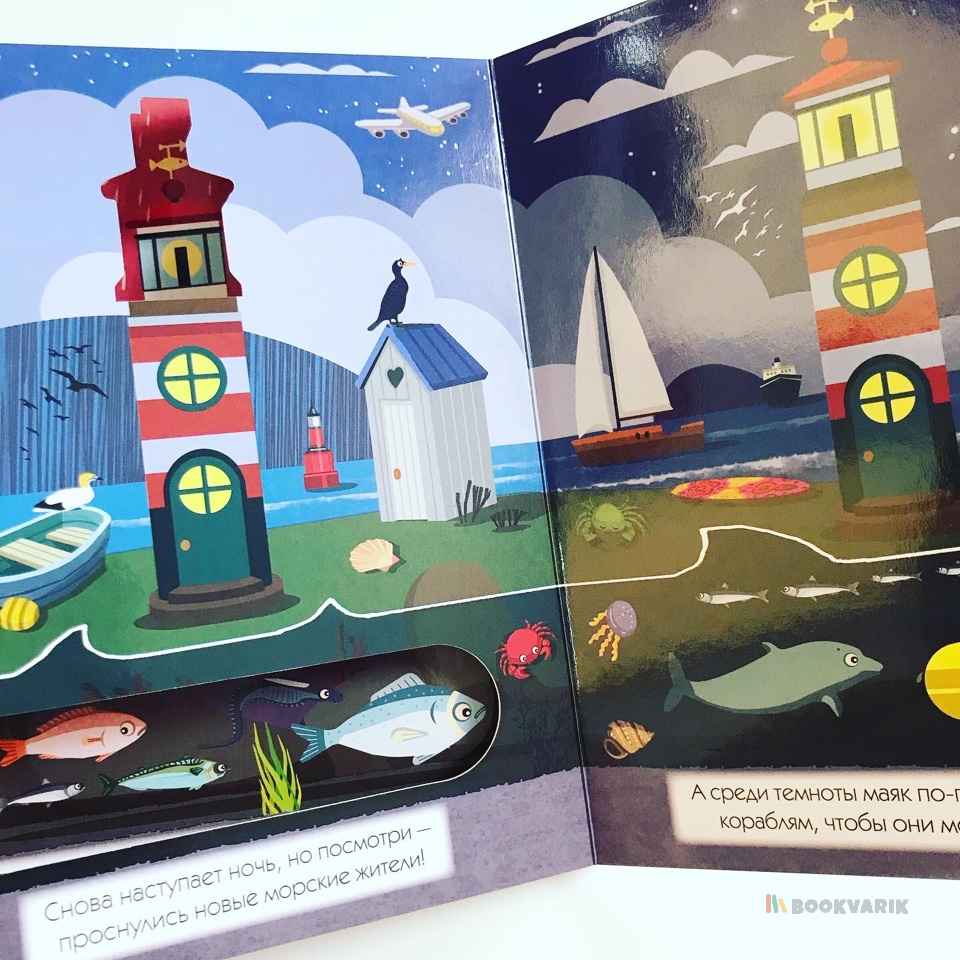Проведите один день на берегу моря и узнайте, как меняется окружающий мир в зависимости от времени суток. Вы можете читать эту книгу и играть с ней: заглядывая в сквозные окошки, вы будете находить героев истории - дельфина, чайку или морскую звезду. На каждой странице детали сменяют друг друга - это так увлекательно, а еще способствует развитию наблюдательности у ребенка.